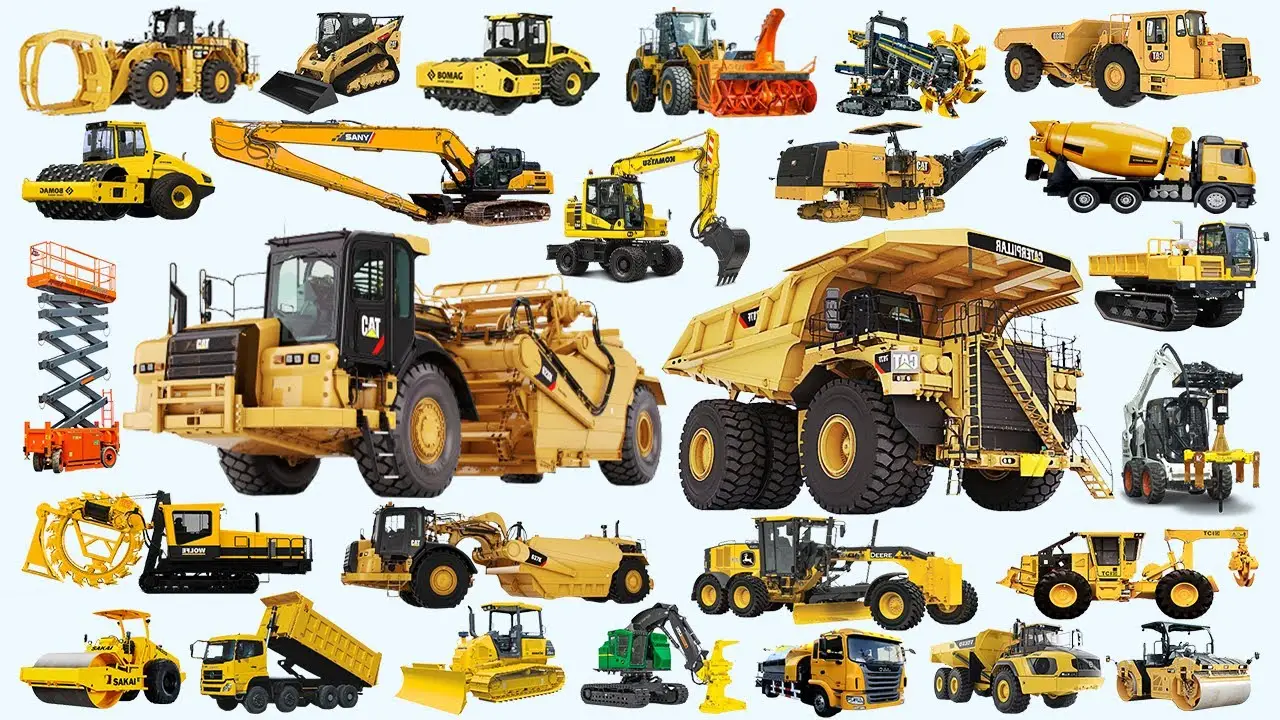 Cranes, bulldozers, forklifts, excavators, and trucks